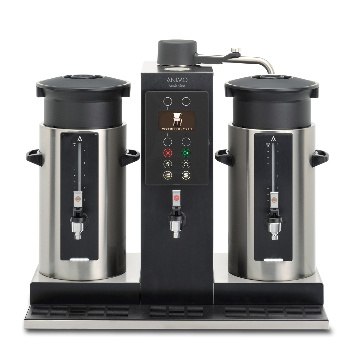 aluminium. Behållarna är placerad på båda sidor av kaffebryggaren. Den